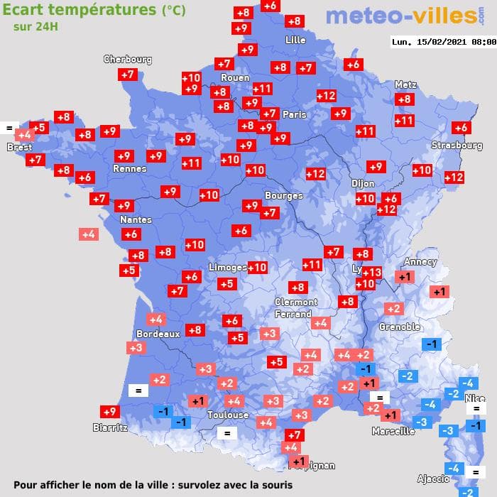 Ecart de températures entre dimanche 14 février 8h et lundi 15 février 8h – Météo-Villes