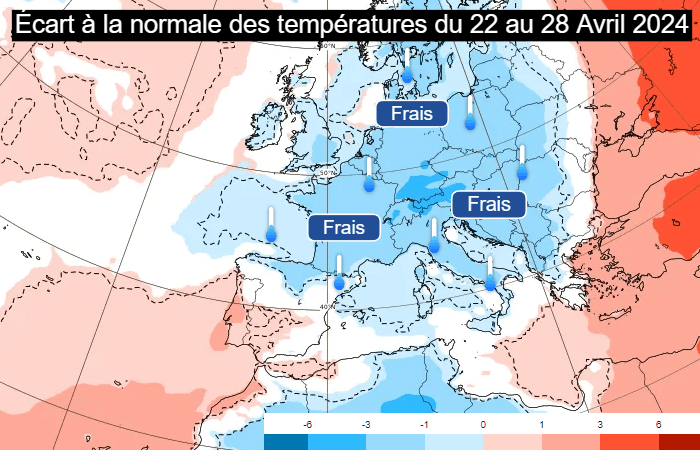 Avec ce flux de nord à nord-est, l'anomalie fraîche devrait donc se prolonger au cours de la semaine prochaine. Les projections envisagent des températures en moyenne 1 à 3°C sous les normales saisonnières durant la semaine du lundi 22 au dimanche 28 avril 2024. Encore une fois, c'est en allant vers l'est que la fraîcheur serait la plus marquée. En Méditerranée, mistral et tramontane pourraient souffler de façon récurrente.