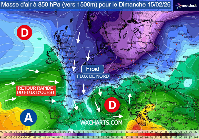 Malgré tout, il ne s'agira absolument pas d'une offensive hivernale majeure - et encore moins durable. En effet, une nouvelle dépression gagnera le nord-ouest des Îles Britanniques dès le dimanche 15 février 2026 avec une nouvelle accélération du flux d'ouest sur le proche-Atlantique, gagnant déjà l'ouest de la France avec un air océanique plus doux dès la journée de dimanche.