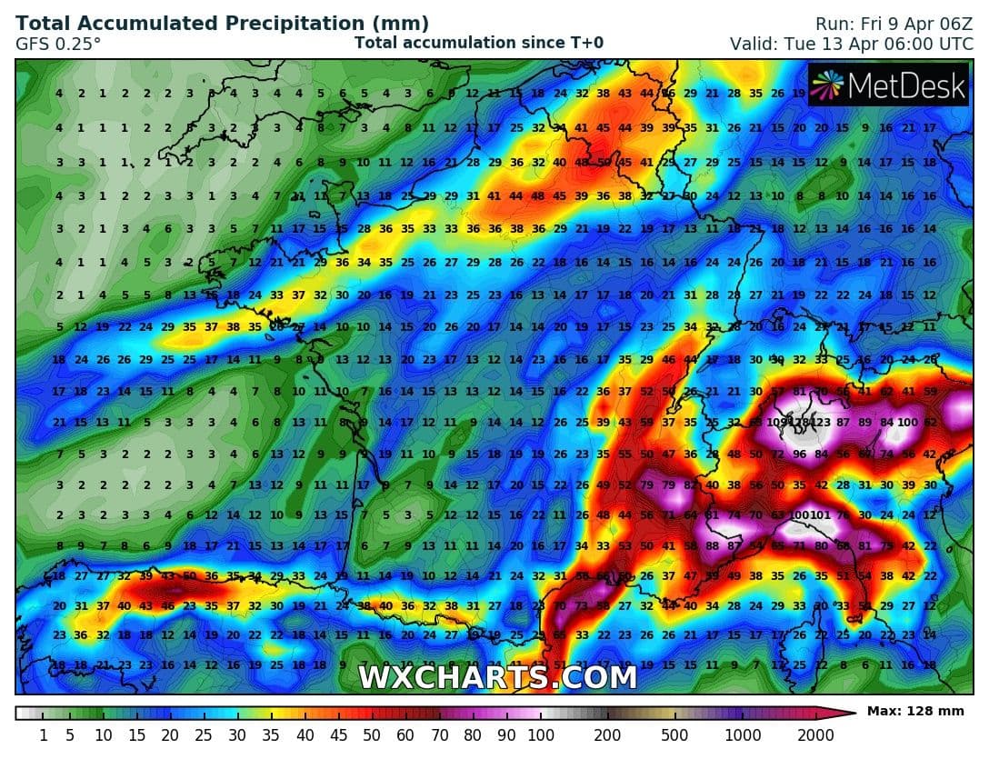 Cumuls de précipitations envisagés jusqu’au mardi 13 avril – Modèle GFS via WX CHARTS