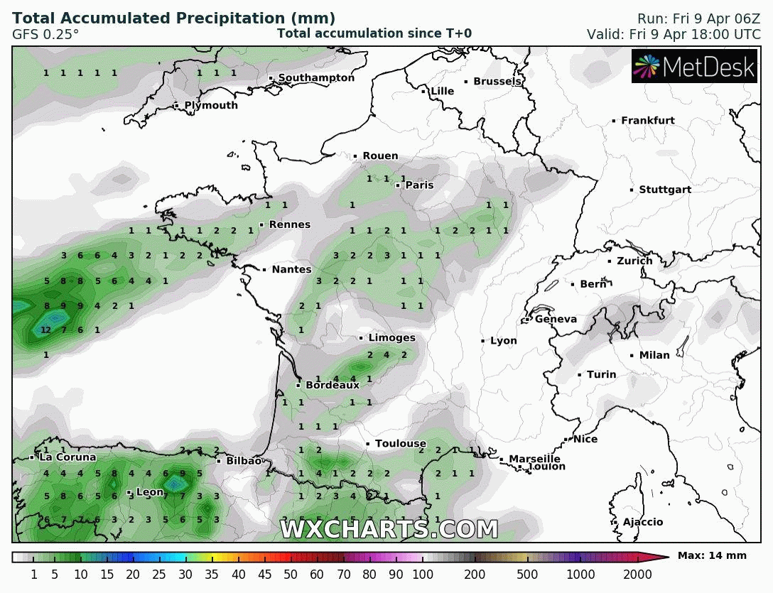 Animation des précipitations sur la France du vendredi 9 au mardi 12 avril 2021 – Modèle GFS via WX CHARTS