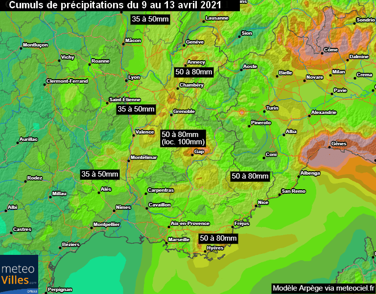 Cumuls de précipitations envisagés jusqu’au mardi 12 avril sur le Sud-Est de la France – Modèle arpège via meteociel.fr