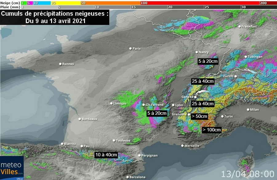 Cumuls de neige envisagés jusqu’au mardi 12 avril sur les reliefs français – Via skipass