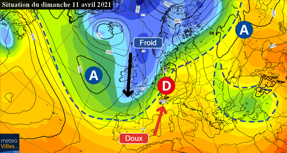 Schéma de la situation atmosphérique du dimanche 11 avril sur l’Ouest de l’Europe – ECMWF, modifié par Météo-Villes