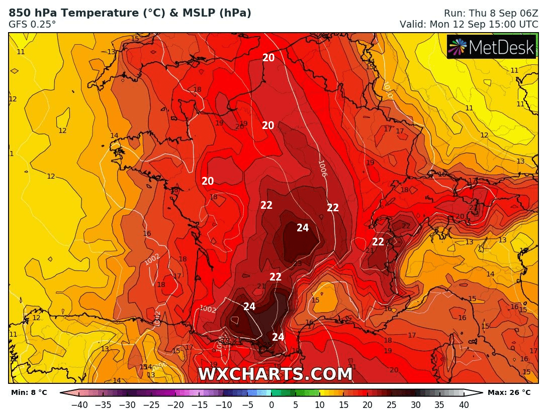 Masse d'air à 850 hPa (vers 1500m) en France pour le lundi 12 septembre 2022 - via wxcharts.com