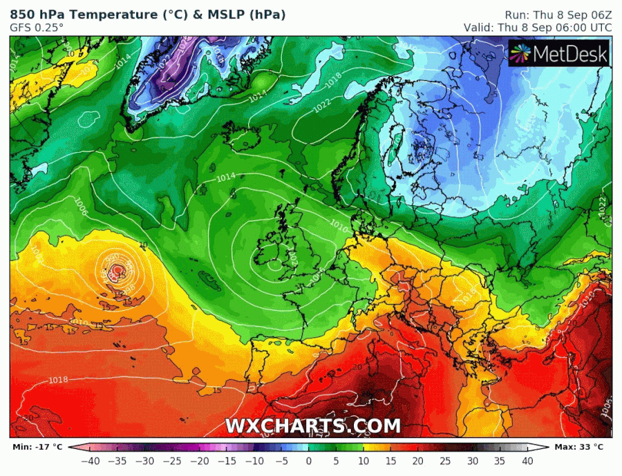 Masses d'air à 850 hPa du jeudi 8 au mardi 13 septembre 2022 - via wxcharts.com