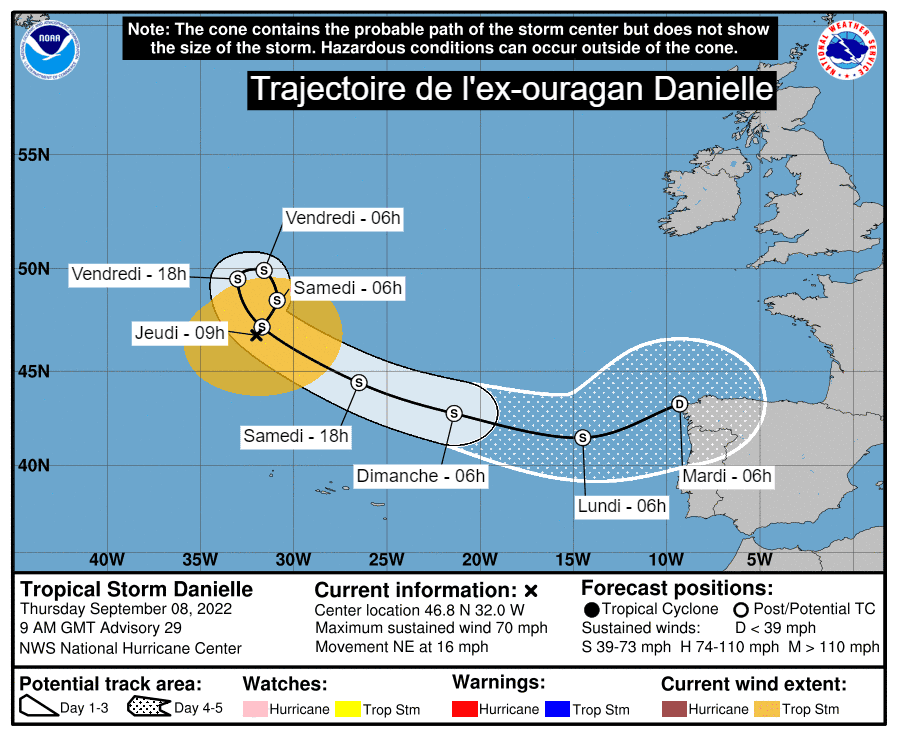 Trajectoire de l'ex-ouragan Danielle jusqu'au mardi 13 septembre 2022 - via NHC