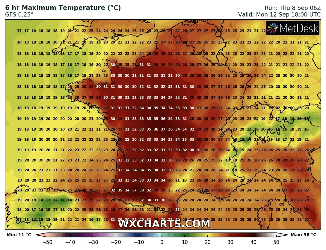 Notons qu'il existe encore des incertitudes sur l'intensité et l'étendue du pic de chaleur, même s'il est très probable que la journée du lundi 12 septembre 2022 soit la plus chaude à échelle nationale. Certains scénarios voient le thermomètre dépasser les 35°C jusque dans le centre de la France, comme le modèle américain qui envisageait des pointes à 37°C sur le sud de la région Centre lors de sa mise à jour de jeudi midi !