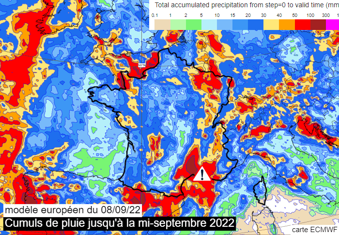 Cumuls de pluie selon le modèle européen jusqu'à la mi-septembre 2022 - via ECWMF