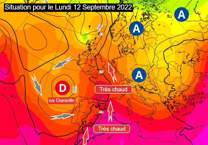 Même si elle n'aura plus rien d'un ouragan, l'ex-Danielle va venir se positionner au large de la péninsule ibérique à compter du dimanche 11 septembre 2022. Or, cette mécanique est bien connu et s'est observée plusieurs fois durant cet été 2022. Quand une dépression stationne dans les parages du Portugal, un flux de sud à sud-est souffle sur la France et entraîne avec lui une masse d'air venue du nord de l'Afrique. C'est exactement ce qui est prévu dès ce dimanche.