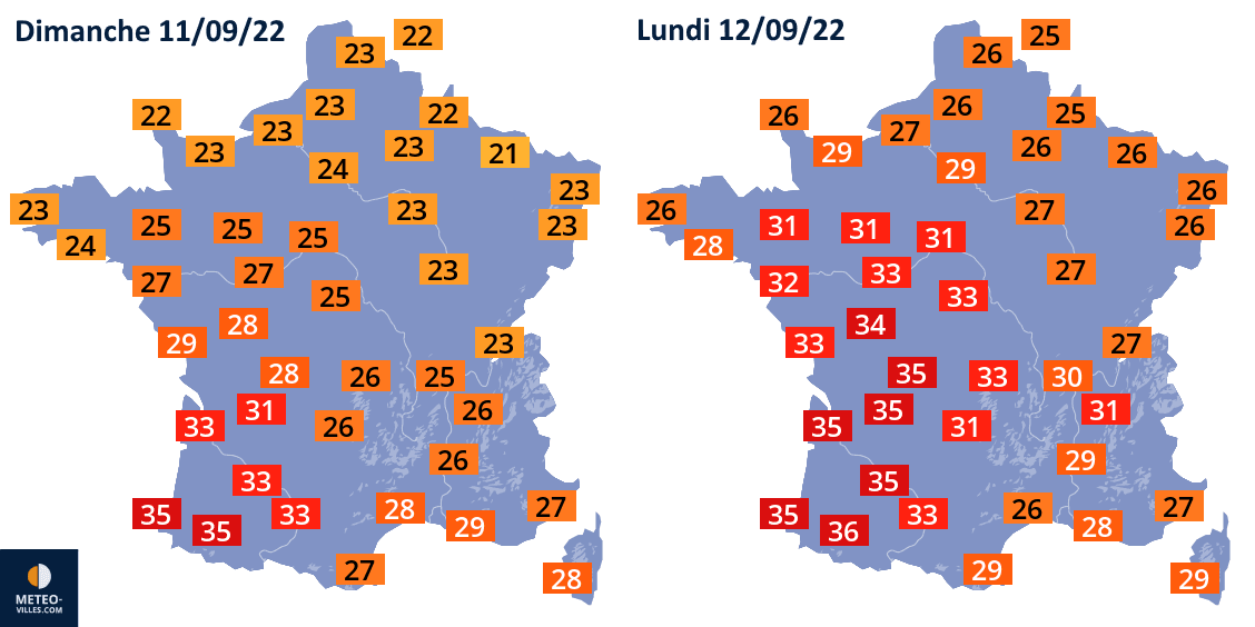 Températures maximales prévues les dimanche 11 & lundi 12 septembre 2022 - Météo Villes