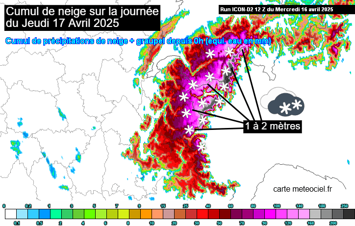Mais c'est surtout à partir du 15 avril que la neige devient vraiment exceptionnelle du côté des Alpes. Durant cette journée, une perturbation se réactive en arrivant sur le Massif-Central et est rattrapée par de l’air très frais en provenance d’Islande, engendrant ainsi d'importantes chutes de neige au-dessus de 400 à 600m d'altitude en Auvergne.