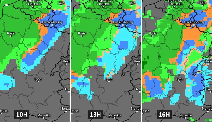Le scénario présenté ci-dessus est celui du modèle européen. Il correspond à la moyenne des scénarios à 3 jours de l'échéance. Il semblerait que la zone neigeuse précédant les pluies se développe en matinée du dimanche 27 décembre 2020 du Massif Central vers le Luxembourg en passant par une partie de la Bourgogne, la Lorraine et la Haute-Marne. Les chutes de neige pourraient ensuite gagner le val de Saône avant que la hausse diurne des températures n'apporte une transition vers de la pluie en cours d'après-midi, notamment entre Franche-Comté et Alsace.