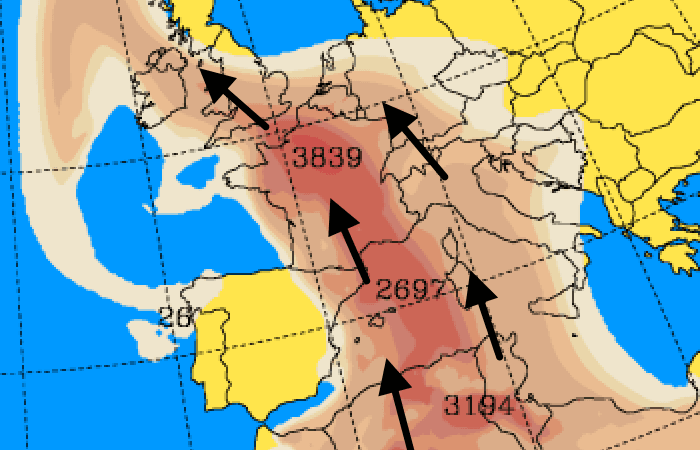 Les hautes pressions sont actuellement installées de la Scandinavie aux Balkans tandis qu'une dépression est présente vers le golfe de Gascogne et la péninsule ibérique. Ainsi, un flux de sud à sud-est dynamique est en place sur la France. Il prend ses racines en Afrique, au dessus du Sahara. C'est la raison pour laquelle de fines poussières de sable se soulèvent et remontent en direction de notre pays, portées par de forts courants d'altitude.
