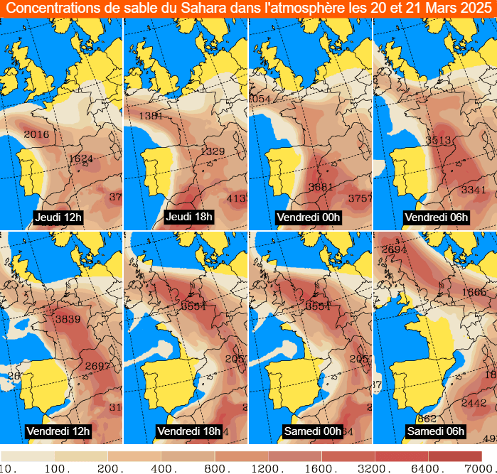 Ces poussières de sable remontent sur le sud de la France ce jeudi 20 mars 2025. Elles gagneront toute la moitié sud et les régions océaniques d'ici la fin de journée puis un nouvel apport, plus conséquent, remontera des Pyrénées et du golfe du Lion vers la Belgique ce vendredi 21 mars. Les concentrations seront passagèrement notables, ce qui rendra le sable visible à l'œil nu dans le ciel. Ces poussières sableuses s'évacueront rapidement par l'Allemagne dès samedi matin.