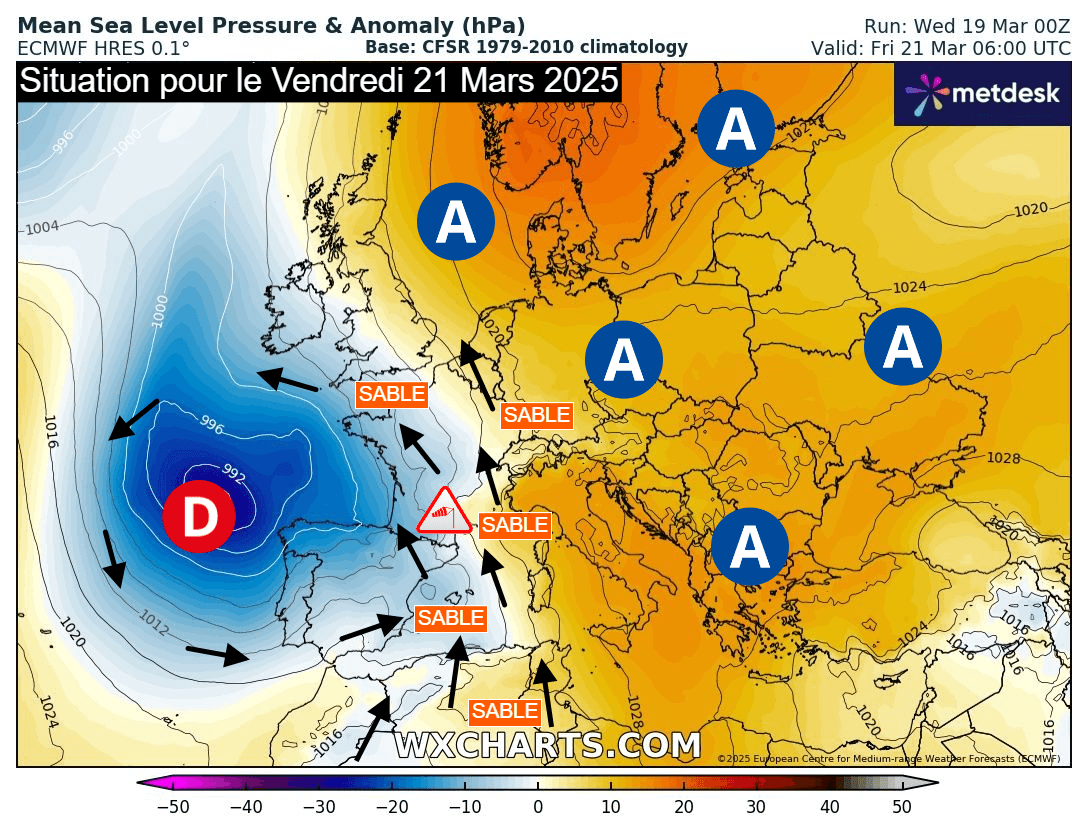 Situation météorologique en Europe ce vendredi 21 mars 2025 avec remontées de sable - wxcharts.com