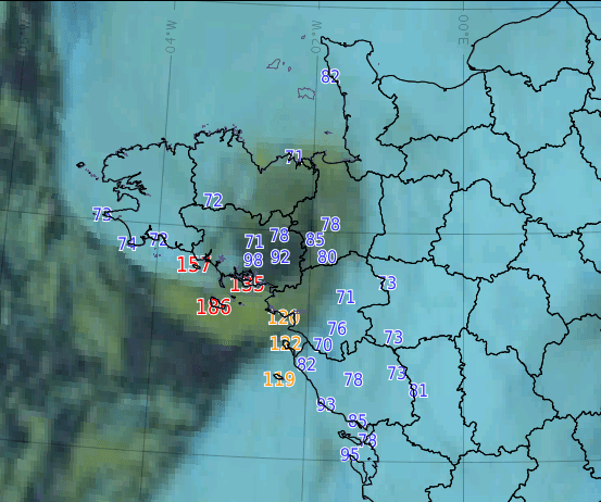 Notons également jusqu’à 157km/h à Groix, 135km/h à Sarzeau, 133km/h à Arzon, 131km/h à Vannes ou encore 116km/h à Rennes. Bien heureusement, cette tempête fut moins violente qu’envisagé sur sa partie Ouest, notamment en Loire-Atlantique où les vents n’ont que très localement dépassé les 100km/h.