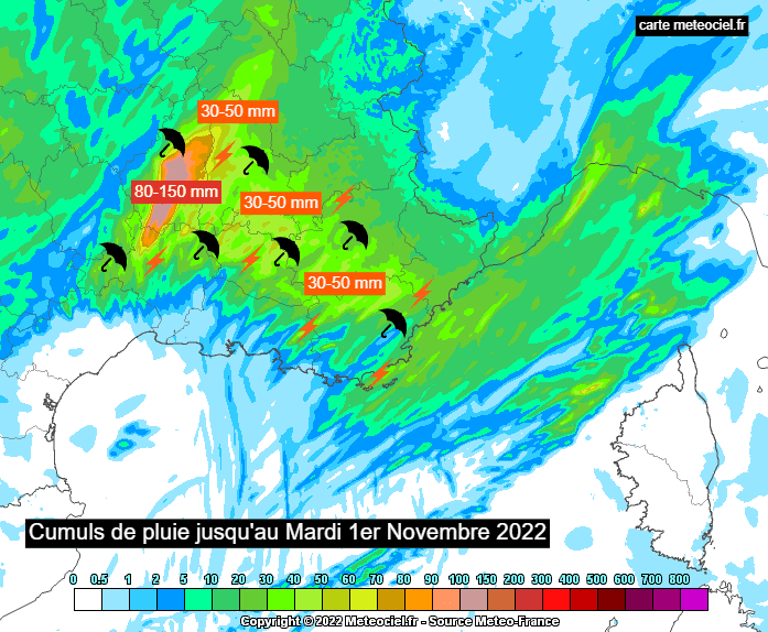Cumuls de pluie prévus du 31 octobre en soirée au 1er novembre 2022 à la mi-journée – via meteociel.fr