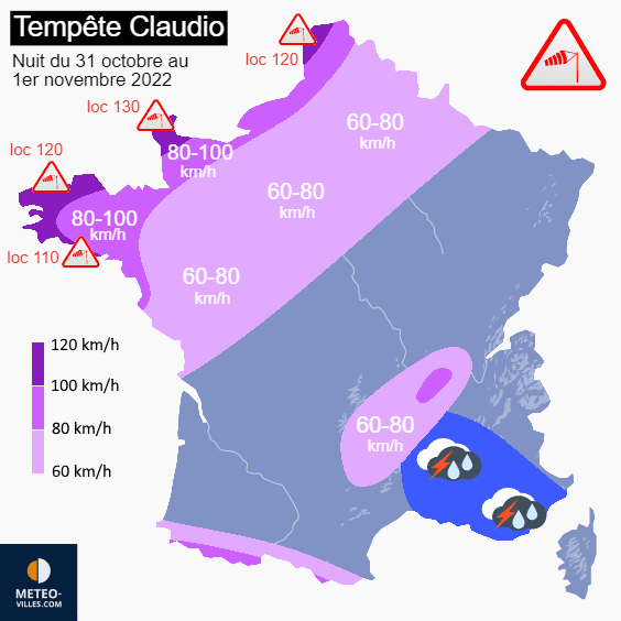 Tempête Claudio : rafales maximales prévues dans la nuit du 31 octobre au 1er novembre 2022 – Météo Villes