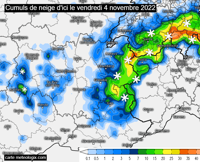 Modélisation des quantités de neige en montagne pour le vendredi 4 novembre 2022 – via meteologix.com