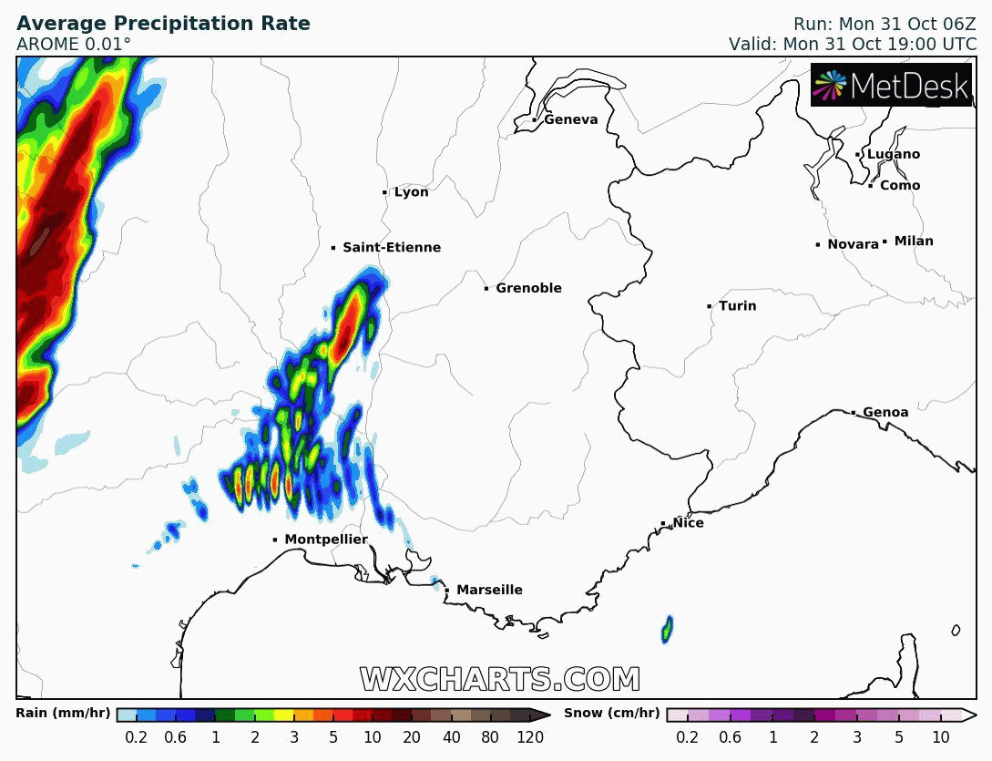 Précipitations au sud-est du 31 octobre en soirée au 1er novembre 2022 à la mi-journée – via wxcharts.com
