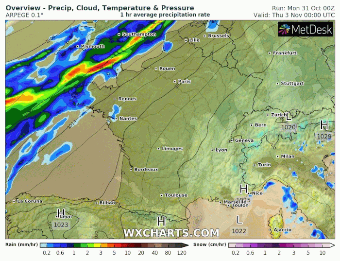 Modélisation des précipitations pour le jeudi 3 et le vendredi 4 novembre 2022 – via wxcharts.com