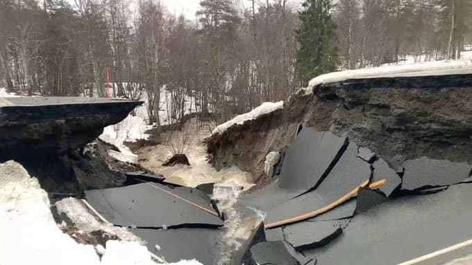 Route effondrée suite aux pluies diluviennes dans le Comté de Trøndelag (Norvège) le 13 janvier 2022 - via EuroNews