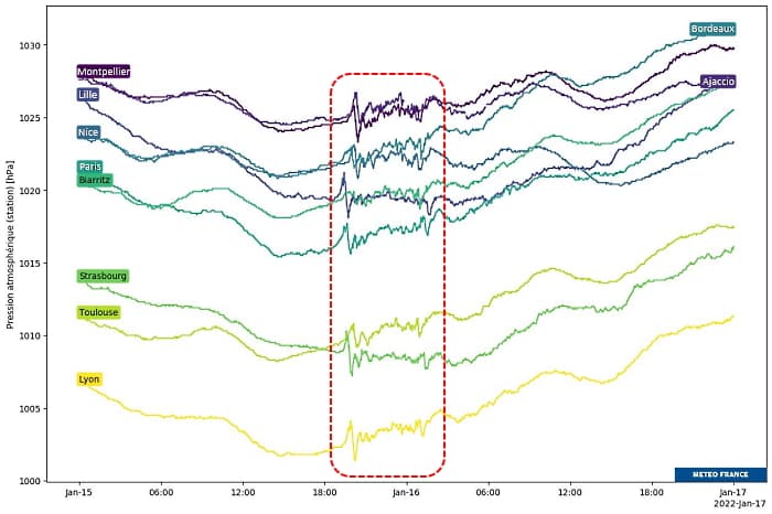 Pourtant éloignée de plus de 16.000 kilomètres des Îles Tonga, la France a vu ses capteurs météorologiques enregistrer l'onde de choc liée à l'éruption volcanique durant la soirée et la nuit du samedi 15 au dimanche 16 janvier 2022 ! En effet, toutes les stations ont réagi par une pression atmosphérique grimpant puis chutant brutalement (sur environ 3 hPa), et ce au passage de deux ondes (la première fut la plus notable). Toutefois, impossible pour un être humain de percevoir quoi que ce soit.