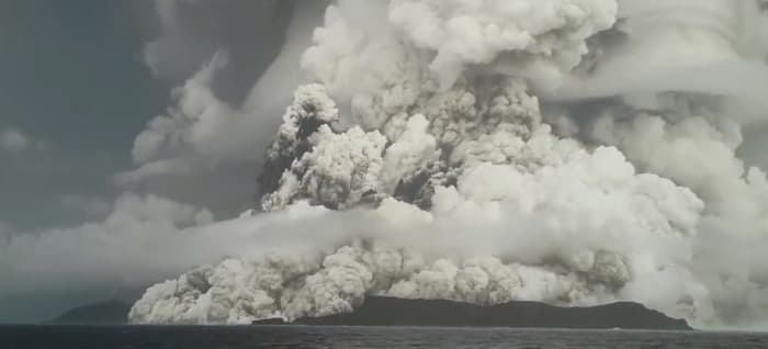 Entré en éruption à la fin de l'année 2021, le volcan sous-marin Hunga Tonga située dans les eaux des îles Tonga dans le Pacifique Sud a subi une véritable explosion samedi 15 janvier 2022 ! Les importantes quantités de lave en fusion entrées en contact avec les eaux de l'océan ont généré cette explosion, dont l'onde de choc s'est propagée à des centaines de kilomètres à la ronde et a pu être mesurée par les capteurs de pression sur la planète entière ! Le nuage de cendres s'est élevé sur près de 20 km de haut et l'île volcanique a presque totalement disparu !