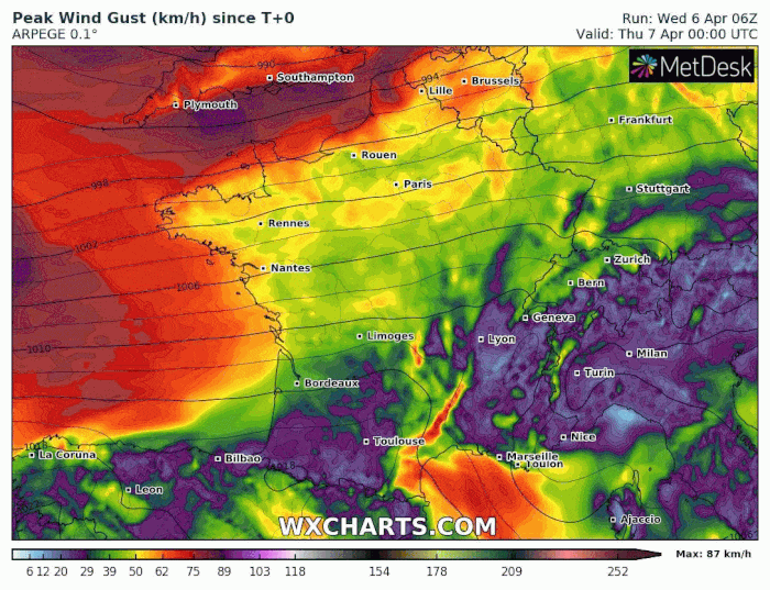 Modélisation des rafales maximales les jeudi 7 et vendredi 8 avril 2022 - via wxcharts.com