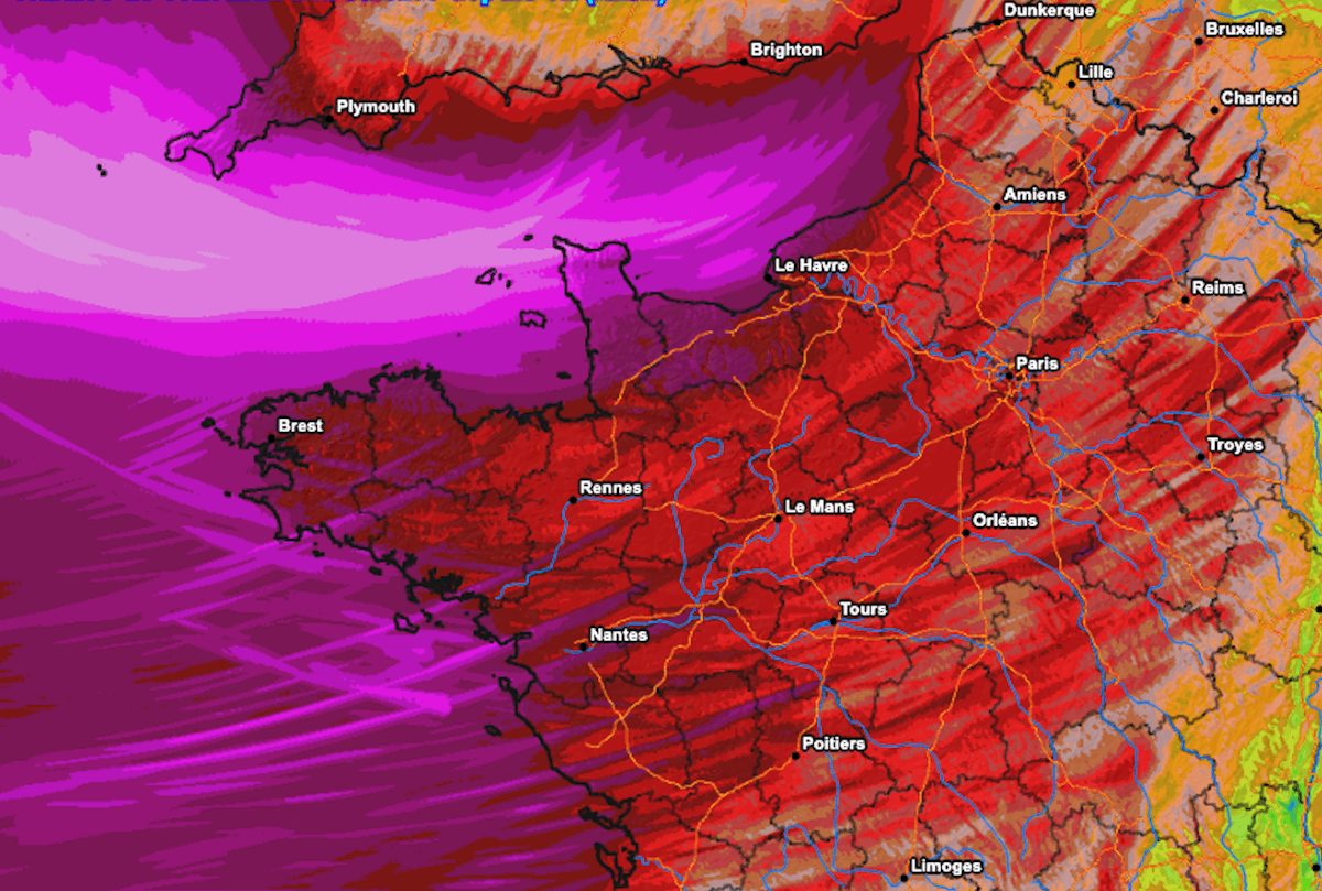 En général, l’ensemble du nord-ouest de la France sera affecté par cette tempête. Sur les territoires des Pays de la Loire, de la Bretagne, de la Normandie, de l’ouest de l’Île-de-France et des Hauts-de-France, les vitesses du vent pourraient excéder les 100 km/h