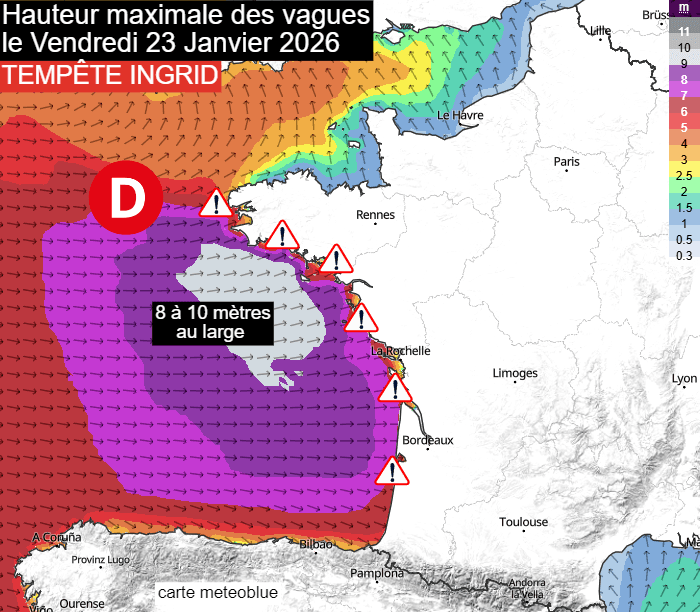 Hauteur maximale des vagues ce vendredi 23 janvier 2026 (tempête Ingrid) - meteoblue