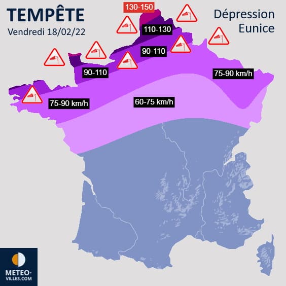 Prévision des rafales maximales de la tempête Eunice le vendredi 18 février 2022 - Météo Villes
