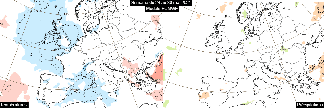 Anomalies de températures et de précipitations durant la semaine du 17 au 23 mai 2021 – Modèle ECMWF