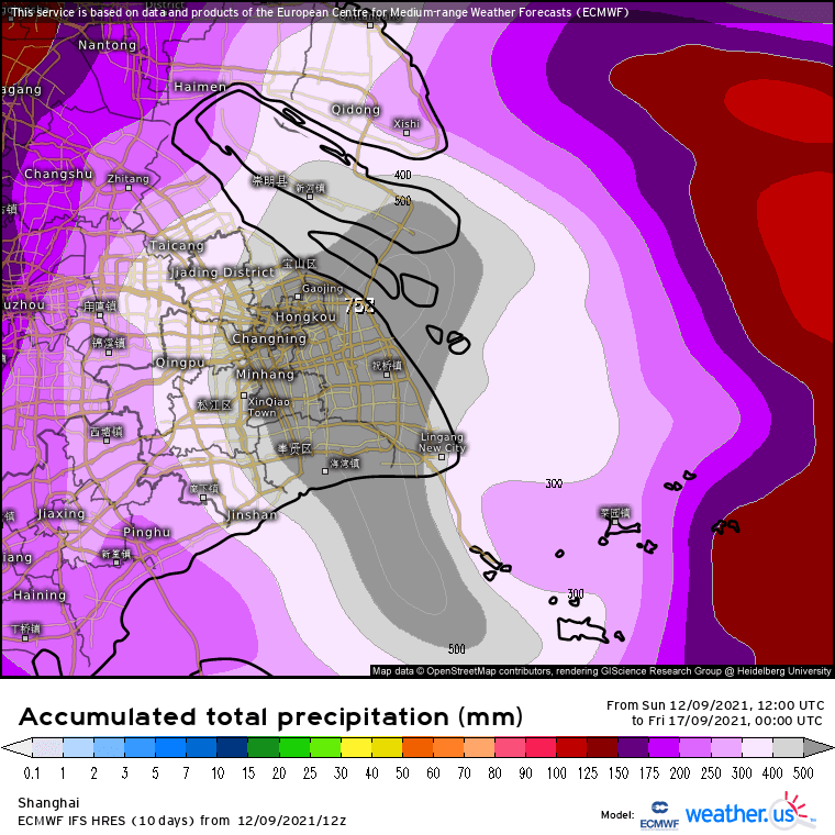 Accumulations de précipitations envisagées jusqu'au vendredi 17 septembre 2021 sur Shanghai – ECMWF