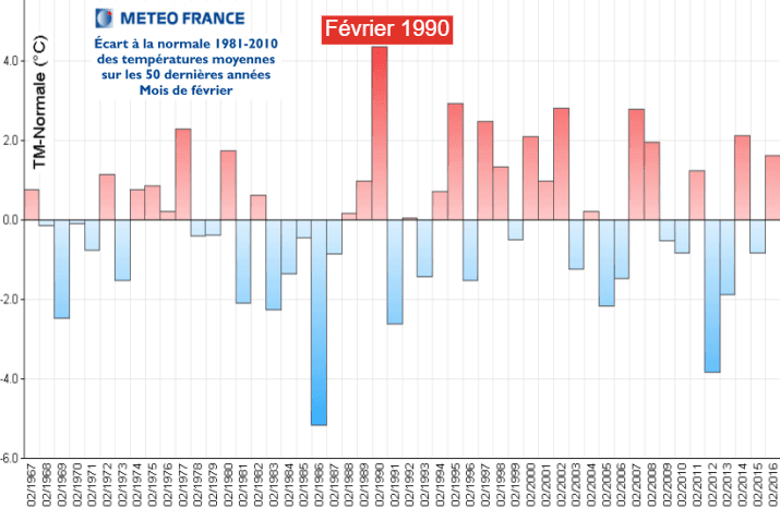 Anomalies de températures en février entre 1967 et 2016 sur la France – Météo-France