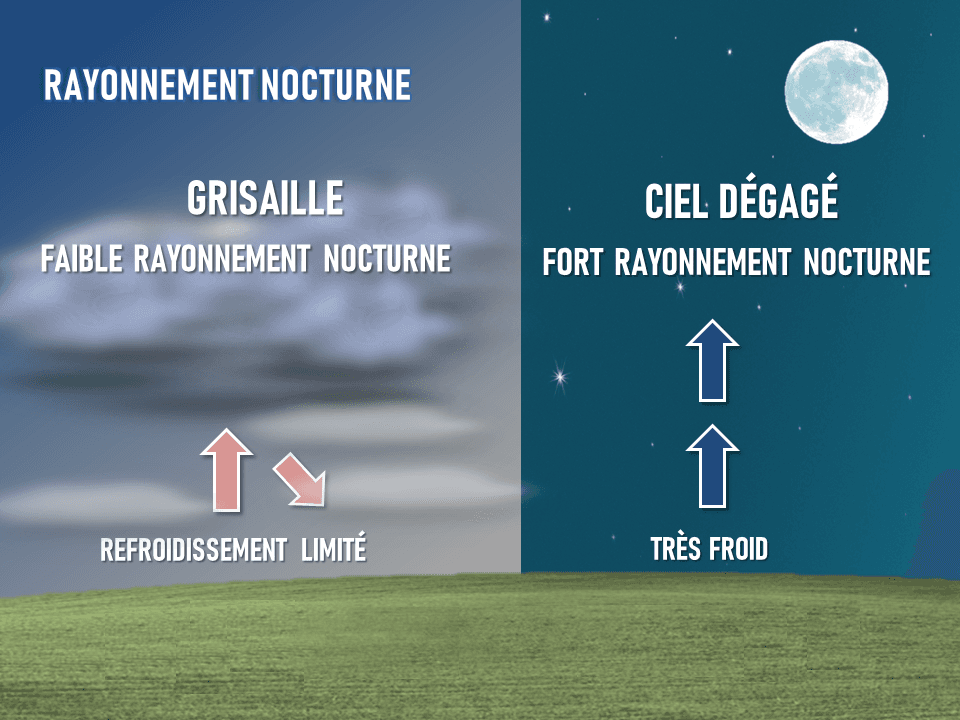 Schéma du mécanisme du phénomène de rayonnement nocturne, favorables aux fortes gelées - Via Météo-BZH