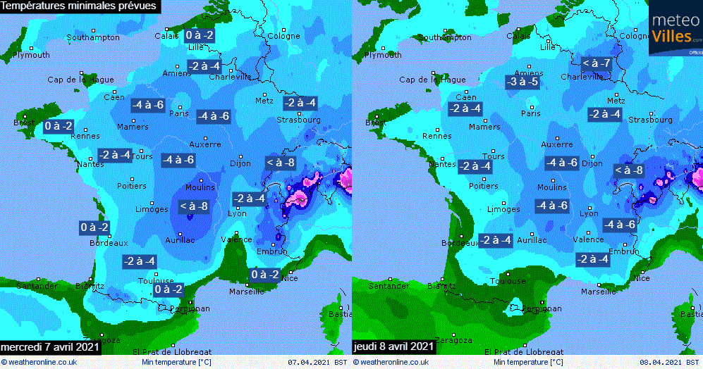 Températures minimales prévues sur la France mercredi 7 et jeudi 8 avril 2021 – Météo-Villes via WeatherOnline