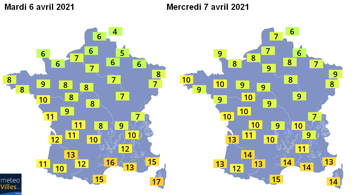 Températures maximales prévues mardi 6 et mercredi 7 avril 2021 sur la France - Météo-Villes