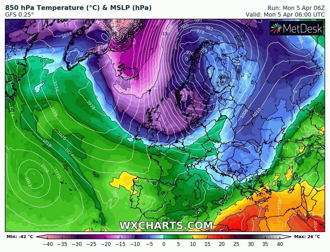 Animation des températures à 850 hPa sur l’Europe entre le lundi 5 et le mercredi 7 avril 2021 – Modèle GFS via WX CHARTS
