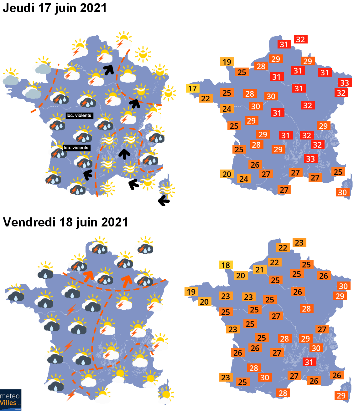 Températures maximales et temps sensible prévus – jeudi 17 et vendredi 18 juin 2021 - Météo-Villes