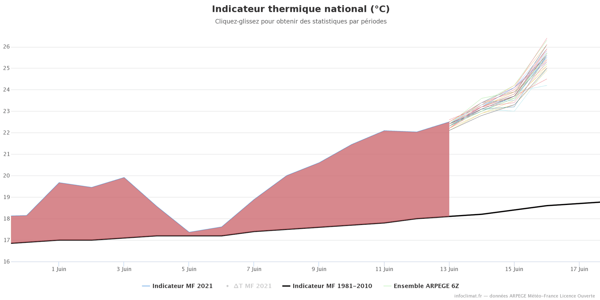 Indicateur thermique national en juin 2021 et prévisions de du modèle ensembliste PE-Arpège jusqu'au 16 juin 2021 - Infoclimat