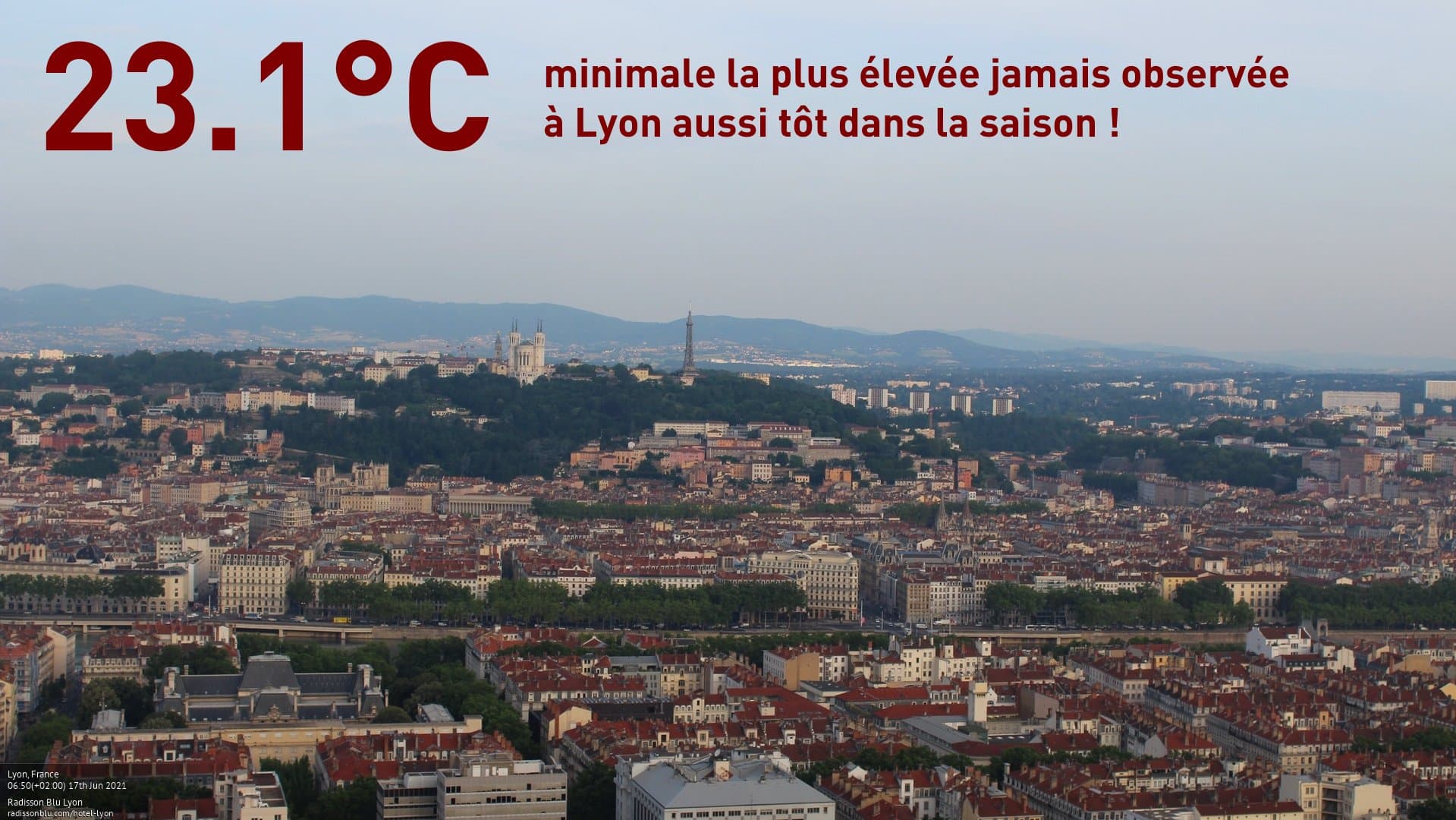 La nuit du 16 au 17 juin 2021 fut remarquablement chaude dans le centre-est du pays et plus particulièrement dans l'agglomération lyonnaise. À Lyon-Bron, le thermomètre n'est pas descendu sous 23,1°C ! Jamais une nuit n'avait été aussi chaude aussi tôt dans la saison. Au parc de la Tête-d'Or, il n'a pas fait moins de 24,3°C !