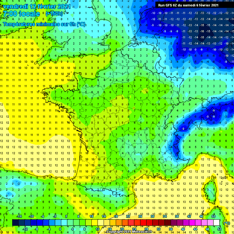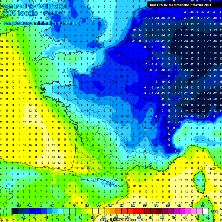 Conséquence : la différence de températures pour cette même date (vendredi 12) est alors excessive. D'un côté des températures matinales supérieures à 3-4°C, de l'autre de fortes gelées généralisées (< -5°C), soit plus de 10°C d'écart !