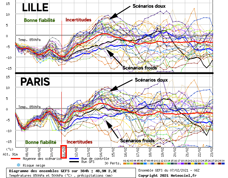 L'incertitude intervient à partir de la journée du jeudi 11 février. A partir de cette date, vague de froid comme douceur sont des possibilités à ne pas exclure sur la moitié Nord. En témoigne pour les villes de Lille et de Paris, où une multitude de scénarios envisagent un pic de douceur autour du 14 février (masse d'air 1500m d'altitude approchant les +10°C), tandis que d'autres, dont le modèle GFS, optent pour un froid vif (masse d'air autour de -5°C à 850hPa voire moins).