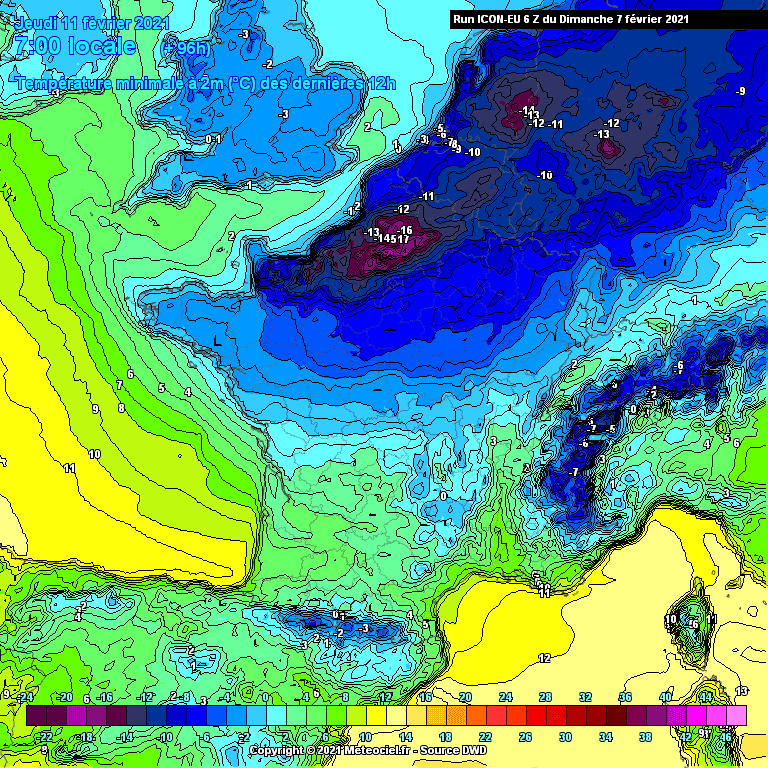 Température minimale prévue par le modèle ICON-EU - matinée du jeudi 11 février 2021 - Meteociel