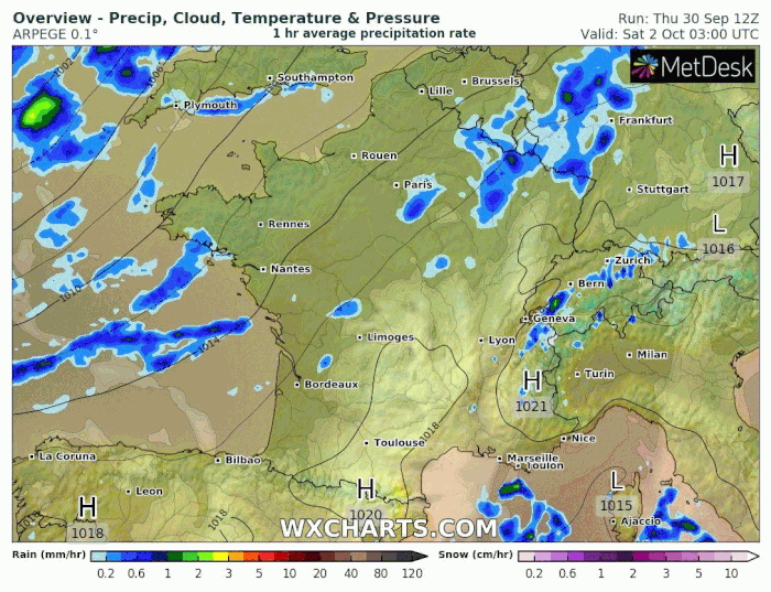 En plus des vents, il conviendra de surveiller avec attention les précipitations associées à cette dégradation. Avec un coeur dépressionnaire tournant sur les Îles Britanniques, la perturbation ne progressera qu'assez lentement sur la France et devrait engendrer un cordon pluvieux important dès samedi et tout au long de la nuit suivante sur le nord et le nord-ouest du pays puis en journée du dimanche 3 octobre dans le sud et l'est. En fin de dégradation, la neige devrait s'inviter sur les Pyrénées et les Alpes vers 2000/2200m.