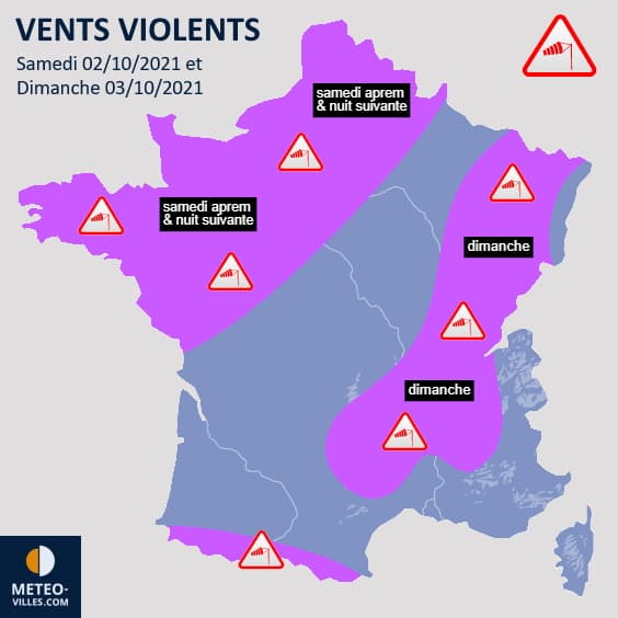 Dans les faits, le quart nord-ouest de la France sera exposé à un risque de coup de vent avec des rafales pouvant atteindre 70 à 90 km/h dans les terres et parfois 100 km/h sur les côtes dès l'après-midi du samedi 2 octobre 2021 ainsi qu'en soirée et nuit suivante. Dans un second temps, de puissantes rafales devraient alors souffler du sud du Massif Central et de la vallée du Rhône jusqu'en Lorraine et en passant par les pré-Alpes. Là aussi, des valeurs de 70 à 90 km/h voire 100 km/h sur les zones exposées sont redoutées.