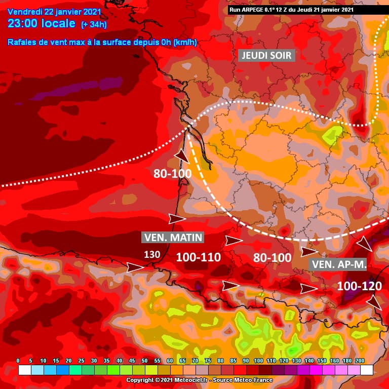 Malgré l'alerte orange sur la Gironde, les toutes dernières modélisations semblent atténuer les rafales de vent sur ce département. Sa partie ouest et sud pourraient tout de même subir des rafales de 80 à 100 km/h. Les plus puissantes vont toucher les Landes et les Pyrénées-Atlantiques en matinée du vendredi 22 janvier 2021 avec des pointes pouvant atteindre 100 voire 110 km/h dans les terres et jusqu'à 130 km/h sur le littoral.