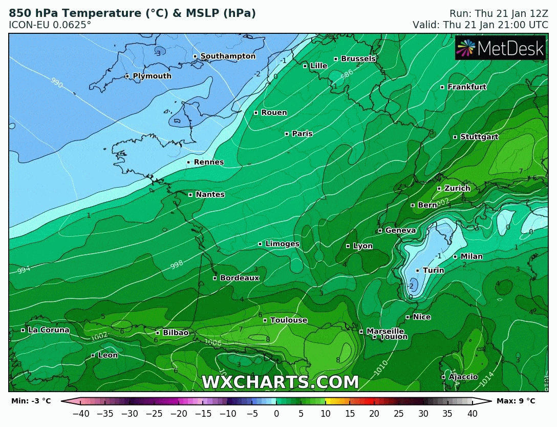L'animation ci-dessus permet d'illustrer la baisse des températures en altitude, ici à 850 hPa (soit vers 1500m). On constate que les masses d'air froid déborderont assez nettement sur le nord et l'est de la France au cours du week-end des 23 et 24 janvier 2021. Avec des températures de -5 à -8°C à 850 hPa, les précipitations qui circuleront sur ces régions pourront ainsi prendre un caractère neigeux jusqu'en plaine.
